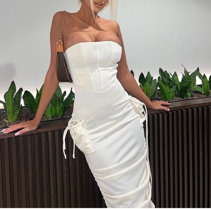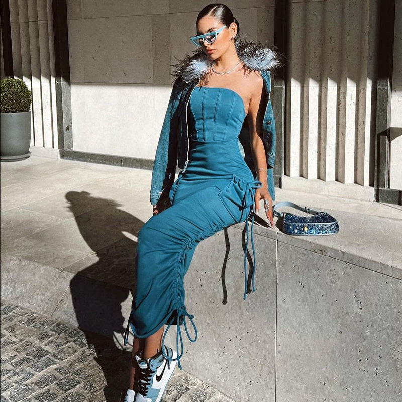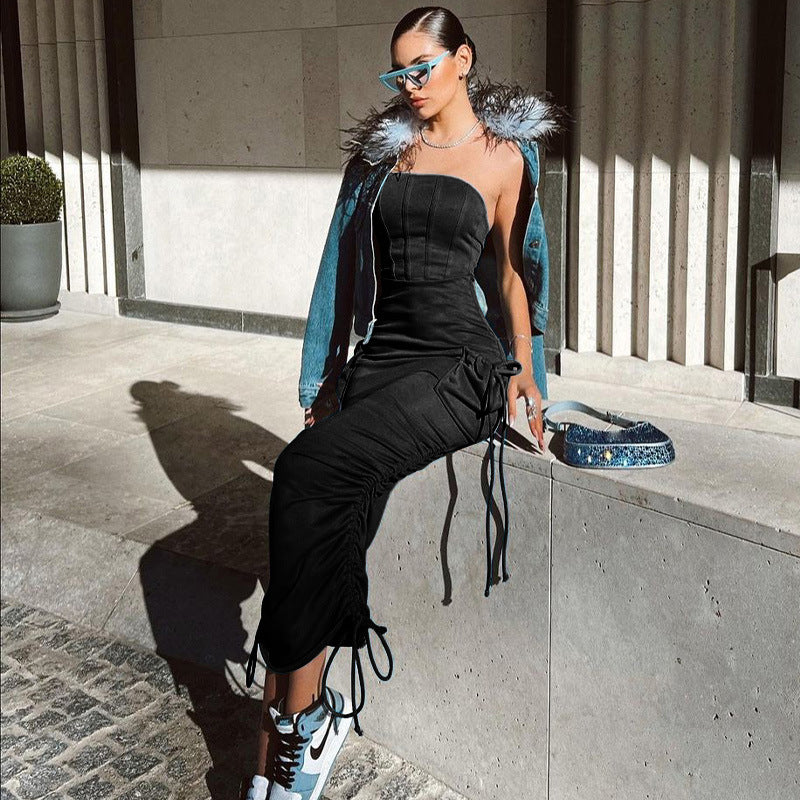 Sheath A Collar Pocket Design Waist Thin Draw Pleated Dress
