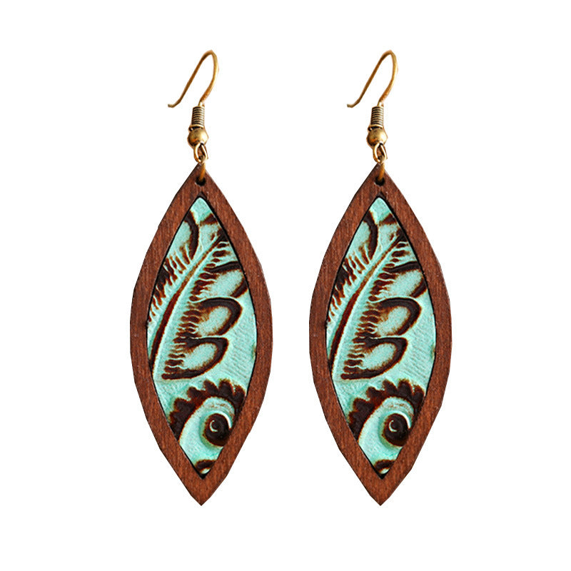 Genuine Leather Retro Embossed Classic Geometric Wooden Earrings